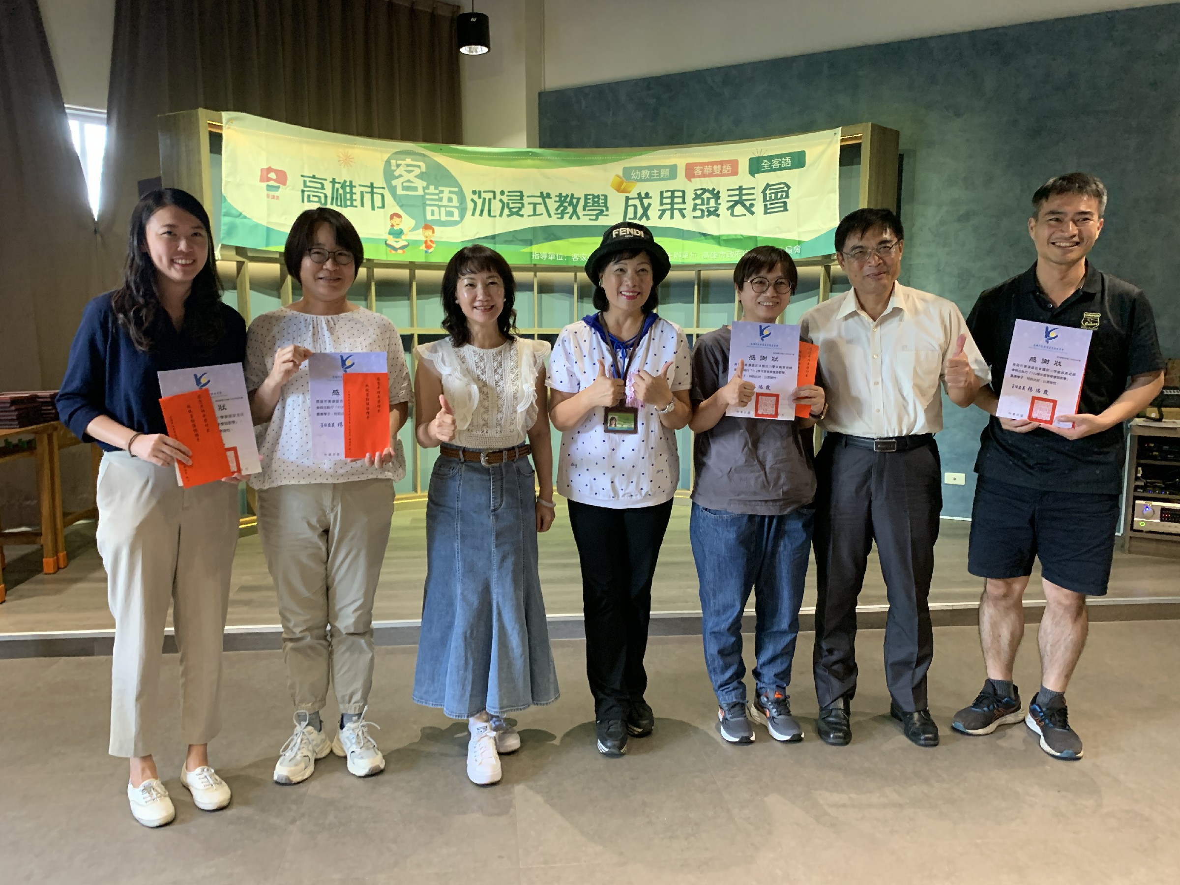 112學年度高雄市共有美濃區美濃國中、龍肚國中、南隆國中、美濃國小、福安國小、中壇國小、東門國小、吉洋國小、龍山國小、吉東國小、龍肚國小、廣興國小、六龜區新威國小、杉林區上平國小、美小附幼、龍肚附幼、廣興附幼、吉東附幼、中壇附幼及上平附幼,計3所國中、11所國小、6所幼兒園、44班、65位教師與學校行政人員共同推動客語沉浸式教學,校數、班級數、教師數與推動模式獨步全台,本學年度成果發表會除了頒發感謝與獎勵以凝聚師長們推動客語復振的向心力外,更首度邀請獲112學年度本土語言融入教保活動課程之教學資源徵選甲等的廣興國小附幼劉家昕老師、獲「2024客家兒童文學創作獎」成人組童話類佳作的福安國小鍾孟年老師及具深厚客華雙語教學經驗的龍肚國中謝昌耀老師進行課程分享,讓與會師長收穫滿滿。