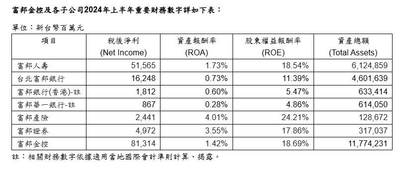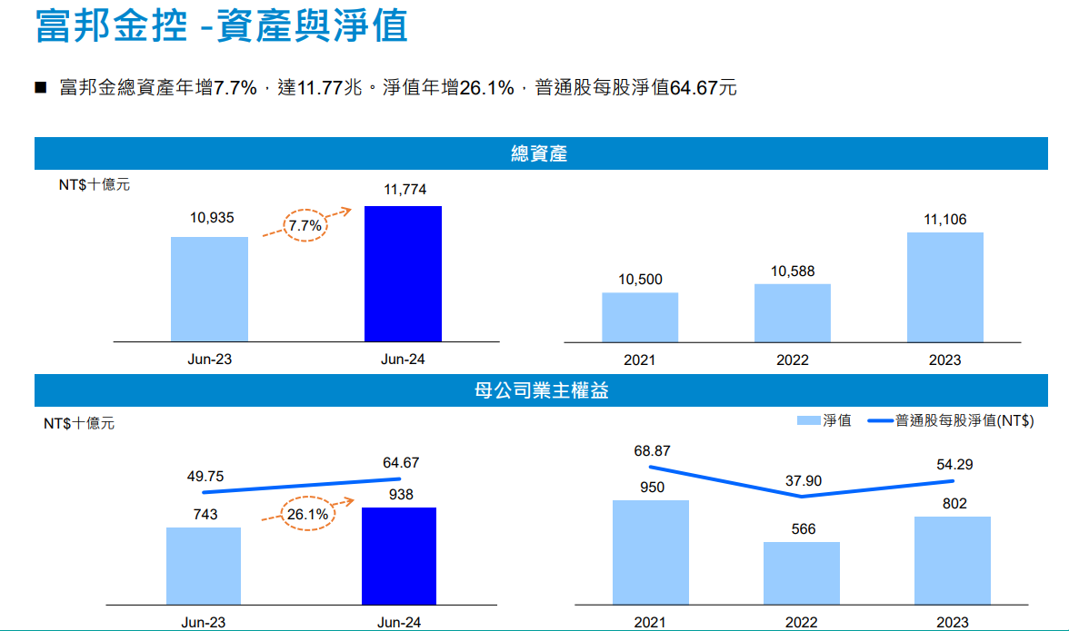 截至6月底,富邦金總資產逾11.7兆元,年增7.7%;淨值9376億元,年成長26.1%,普通股每股淨值64.67元。資產報酬率(ROA)與股東權益報酬率(ROE)分別為1.42%與18.69%,皆較去年同期提升。