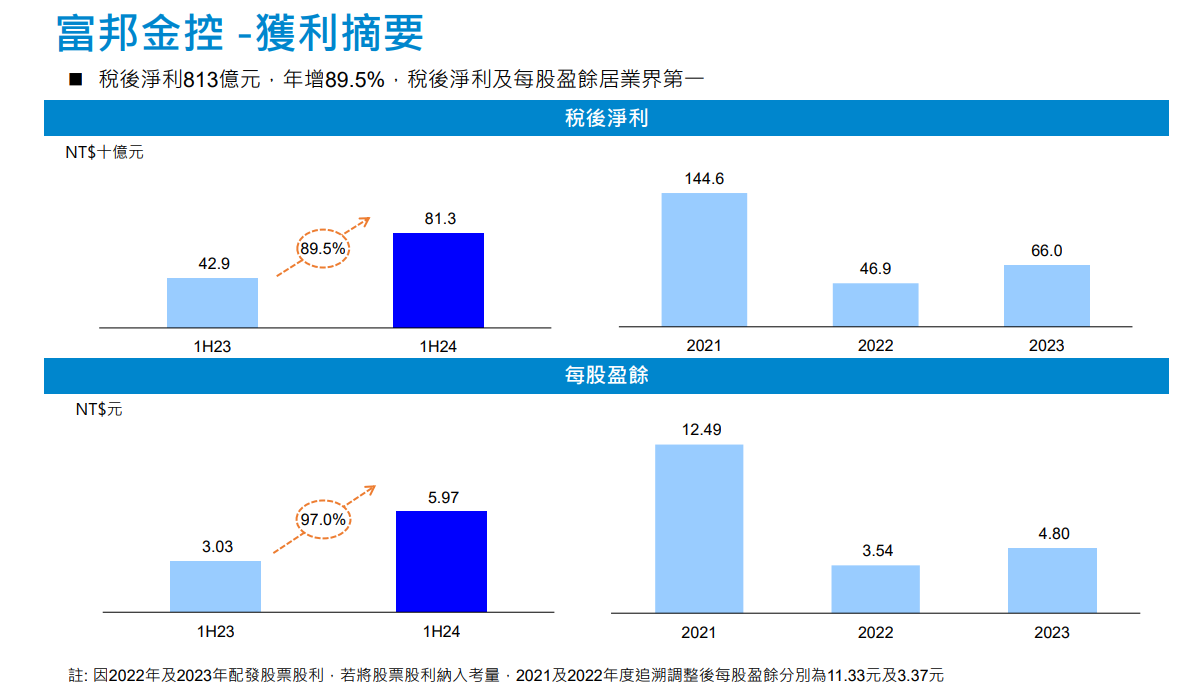 富邦金法說會公佈上半年稅後淨利813.1億元,每股盈餘(EPS)5.97元,稅後淨利、每股盈餘穩居金控業之冠。