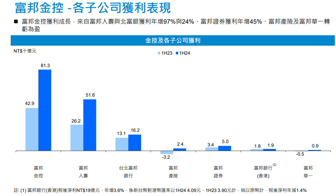 旗下子公司富邦人壽上半年稅後淨利515.7億元,居業界第一,年增97%;台北富邦銀行上半年稅後淨利162.5億元,續創歷史同期新高,年增24%;富邦證券上半年獲利49.7億元,年增44.6%;富邦產險上半年稅後淨利24.4億元,續居市場龍頭。