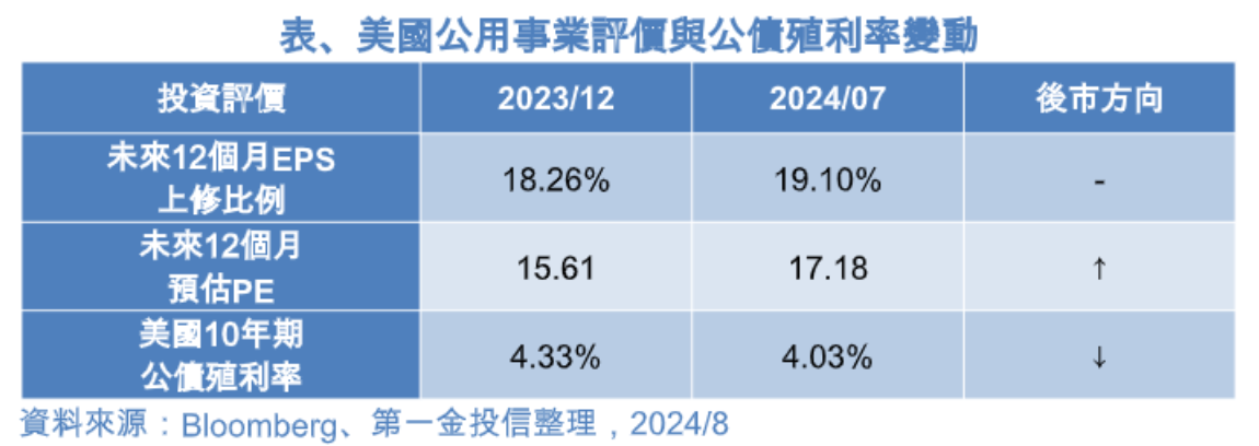 林志映說明,美國降息預期,提早反應在美債殖利率、公用事業獲利及投資評價變化,10年期美債殖利率由去年底的4.33%,7月底降至4.03%,最新殖利率更降至3.8%;同期也見公用事業股獲利上調比例提升,帶動未來12個月評價較去年底上升至17.18倍。