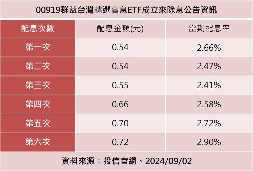 這次是00919成立以來第六次配息,歷次配息金額分別為0.54、0.54、0.55、0.66、0.7元,這次配發0.72元,再創掛牌新高,以今日收盤價24.83元來計算,年化配息率近11.6%,連續6季衝破10%,再度刷新台股ETF配息紀錄。