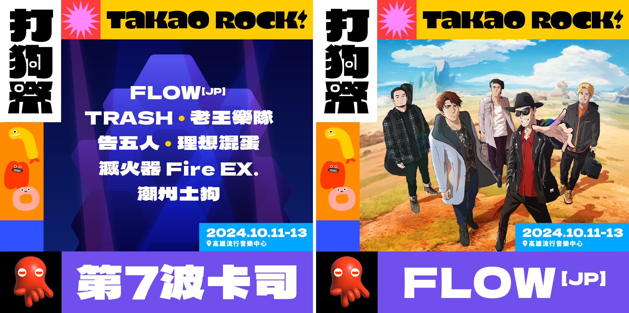 ↑圖說:2024 Takao Rock打狗祭第七波「一起大聲唱」特色卡司,告五人 理想混蛋 滅火器入列。FLOW為成軍超過20年的日本人氣搖滾樂團,因多次為動畫《火影忍者》演唱主題曲而大受歡迎。(圖片來源:高雄流行音樂中心提供)