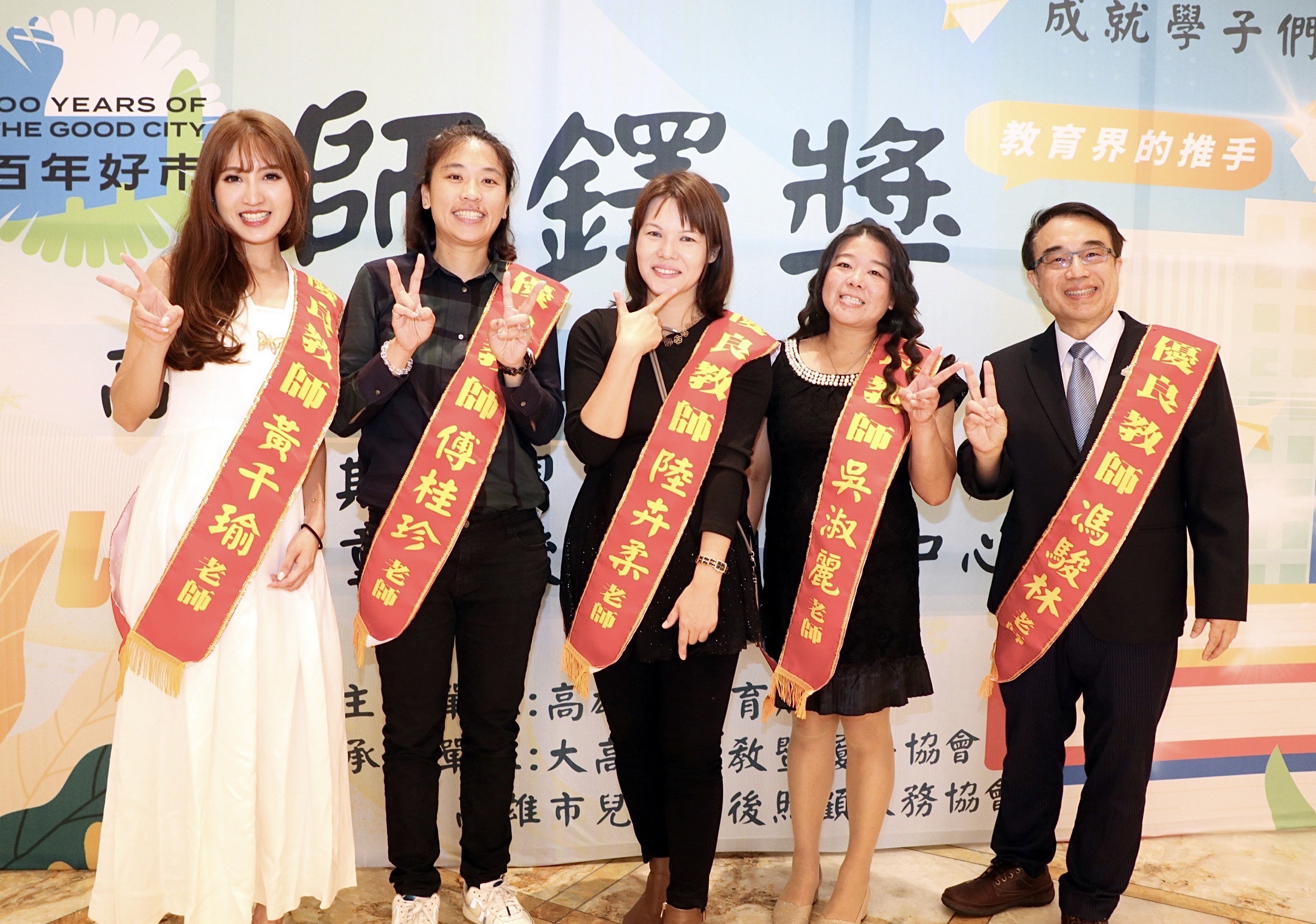 ↑圖說:高雄市補習班暨兒童課後照顧服務中心「師鐸獎」,表揚(左至右)黃千瑜(私立建功文理短期補習班岡山分班)、傅桂珍老師(私立冠題文理短期補習班)、陸卉柔老師(私立鹿鹿Fun學兒童課後照顧服務中心)、吳淑麗老師(私立大樹兒童課後照顧服務中心)、馮駿林老師(私立浩瀚文理短期補習班)等80人獲頒優良教師獎、優良班主任獎、優良創辦人獎與特殊貢獻獎。(圖片來源:高雄市教育局提供)