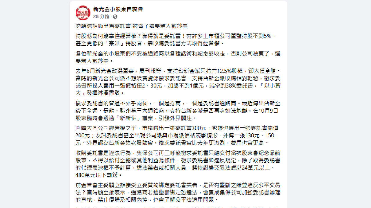 ↑圖說:新光金小股東自救會呼籲小股東出席股臨會,勿貪小利交出委託書。(圖片來源:翻攝自臉書)