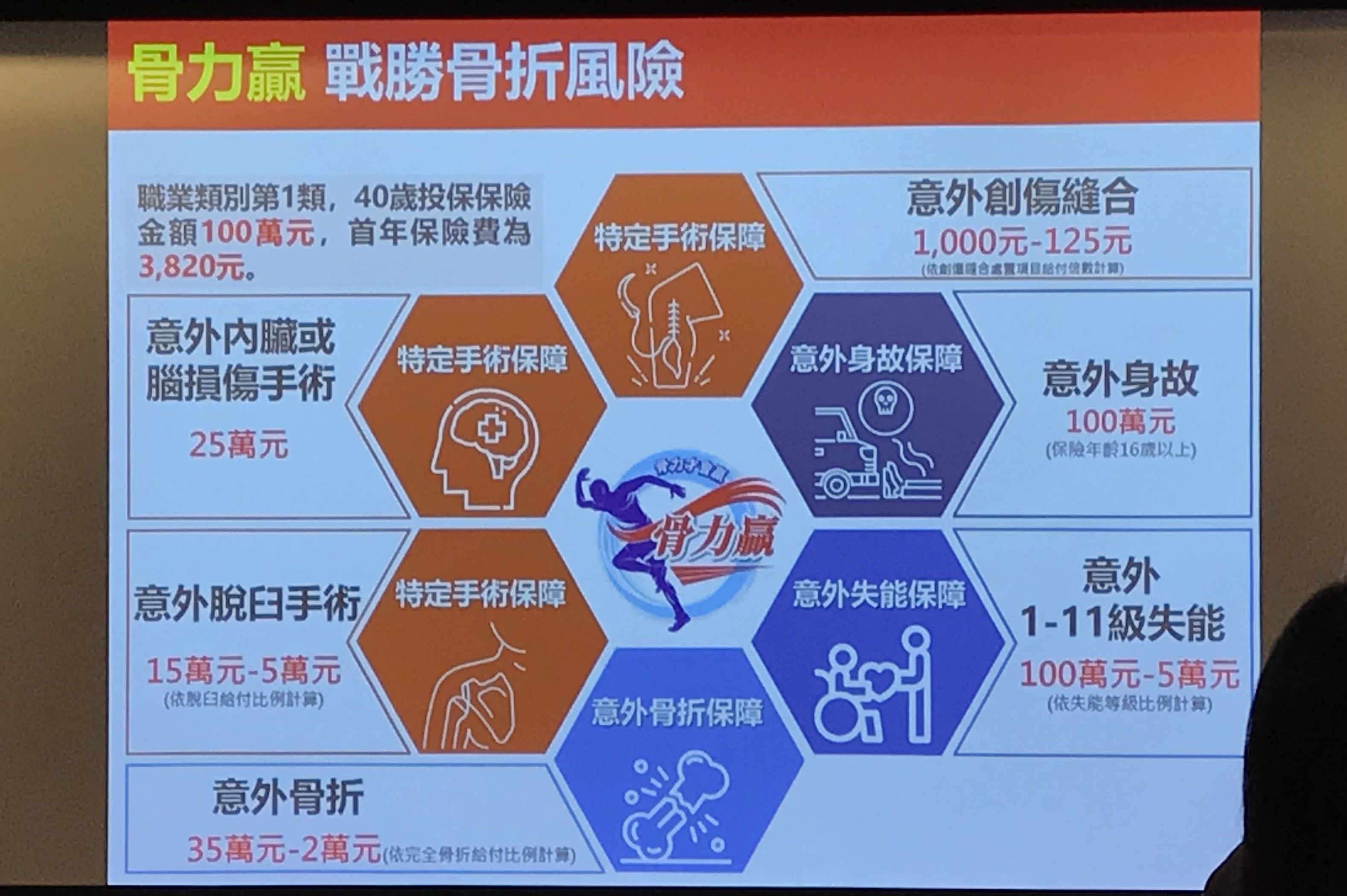 考量市場有強化骨折保障的需求,新光人壽9月也推出全新的「新光人壽骨力贏傷害暨兒童意外骨折保險附約」(以下簡稱:骨力贏),兼顧意外身故、意外失能、意外骨折、意外脫臼、意外內臟或腦損傷手術及意外創傷縫合等多元保障,並開放嗣後附加,也可滿足有效契約保戶的投保需求,讓保戶可彈性搭配。(如下圖,記者李錦奇攝影)