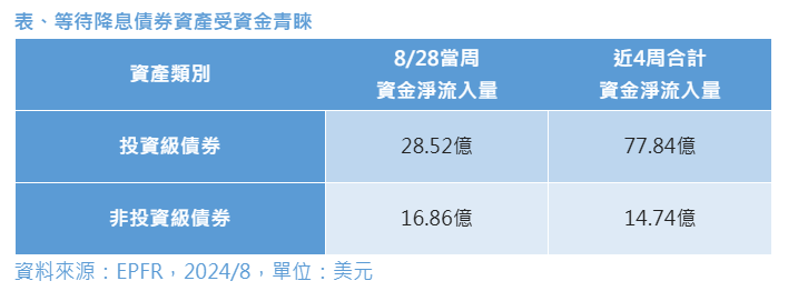 第一金投信指出,根據EPFR資金流量數據統計,隨市場預期降息逼近,債券資產投資者加碼各類固定收益資產,隨市場預期聯準會月中將啟動新一輪降息循環時間逼近,投資級債券與非投資級債券都受到資金青睞,至8月底當周投資級債券淨流入28.52億美元,於全球資產佔比達0.29%,過去4周資金淨流入量達77.84億美元。