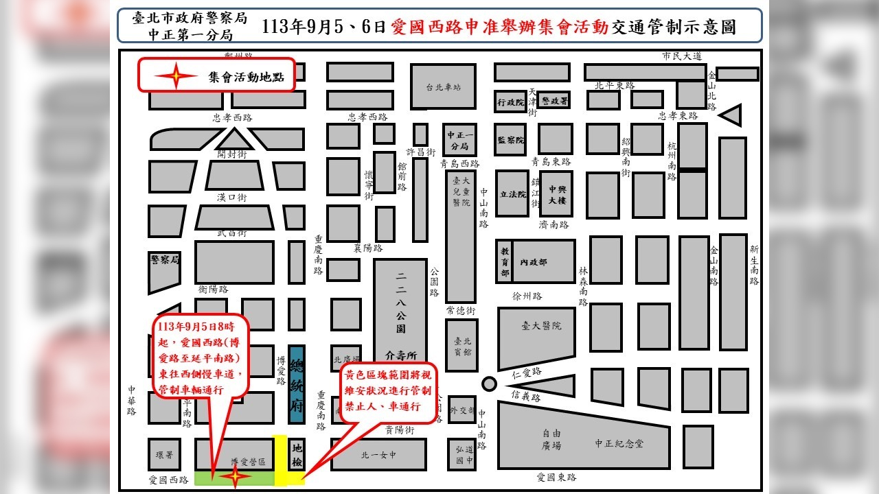 台北市警察局中正一分局證實,已收到民眾黨人士申請集會,中正區愛國西路已申准舉辦「司法正義」集會活動,時間從9月5日至9月6日,每日8時至22時,愛國西路(博愛路至延平南路)東往西側慢車道全線,將管制車輛通行,並視現場狀況及人數,擴大周邊交通管制範圍。