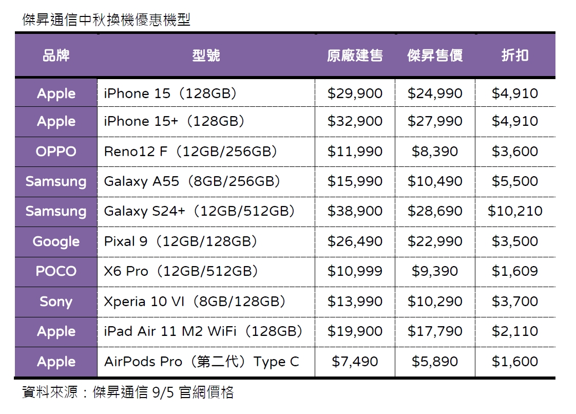 傑昇通信祭出中秋換機優惠快閃,即日起至9月8日,包含最新的Google Pixel 9直降3500元優惠,iPhone 15打84折,Galaxy S24+現省破萬元,小資族無痛入手的OPPO Reno12 F更是降到萬元有找。