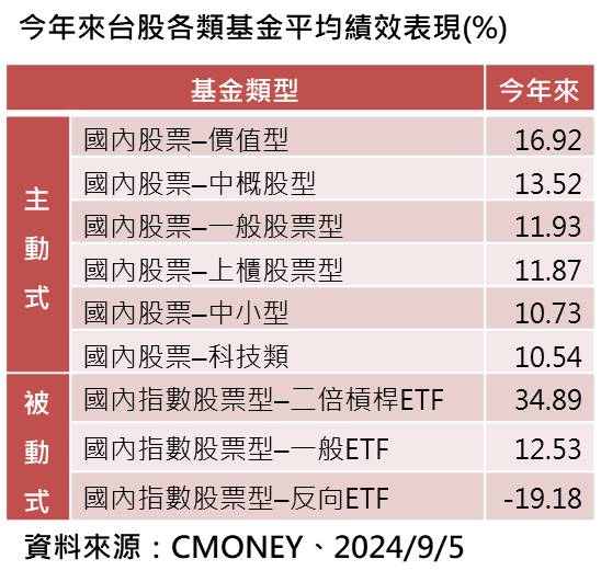 台股近期拉回整理,截至昨天為止,今年以來累計漲幅收斂至18.16%,觀察投信發行的台股各類型基今年來績效平均表現,以價值型表現最好,達16.92%,其次依序為中概型13.52%、一般股票型11.93%、上櫃股票型11.87%、中小型10.73%、科技型10.54%,整體來看,台股基金平均績效全不如大盤,平均漲幅12.58%,至於被動式台股ETF,今年含息報酬率有17.16%,也同樣落後台股。