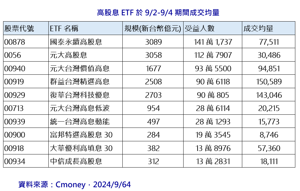 專家表示,9月要除息的ETF總共有50檔,有10檔以上是高股息ETF,00878因為8月已經進行第三季除息,但本週成交均量仍超過7.7萬張。