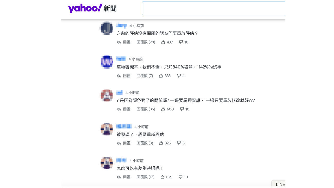 網友們認為,「之前的評估沒有問題的話為何要重啟評估」、「這種容機率,我們不懂,只知840%被關,1142%的沒事」、「標準要一樣ㄟ」、「第三方當然是要聽話的那一方」、「有黨證就是不一樣,還能有悔棋的機會,沒黨證的直接搜索羈押」、「為什麼不聲押避免串供」、「特定第三方嗎」、「怎麼沒有55張搜索票去其邁哥家」。
