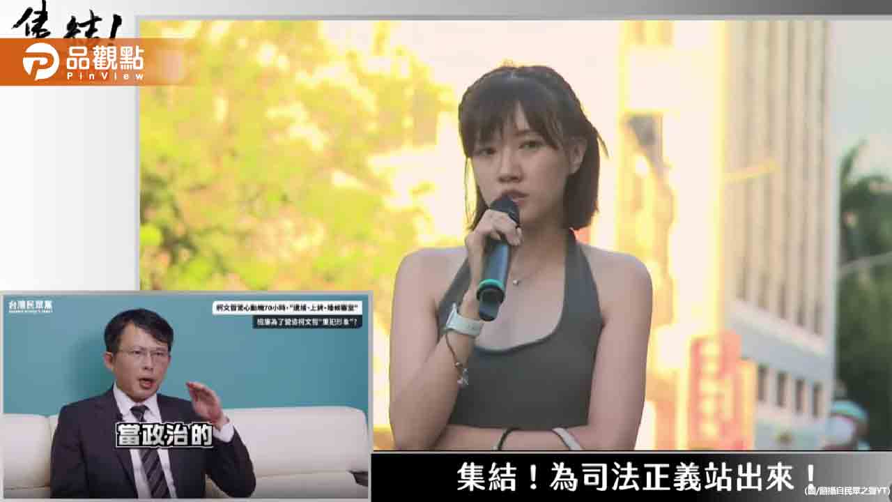 民眾黨主席柯文哲因京華城案遭羈押禁見,民眾黨於8日在台北市舉行聲援活動。活動現場湧入上萬名支持者,其中包括從中南部北上的「小草包」車隊,至少有20輛遊覽車到場。活動中,民眾黨邀請現場支持者上台發表訴求。一位外型亮眼的張姓女子上台發言時,以中英夾雜的「晶晶體」發言,引發關注ㄡ