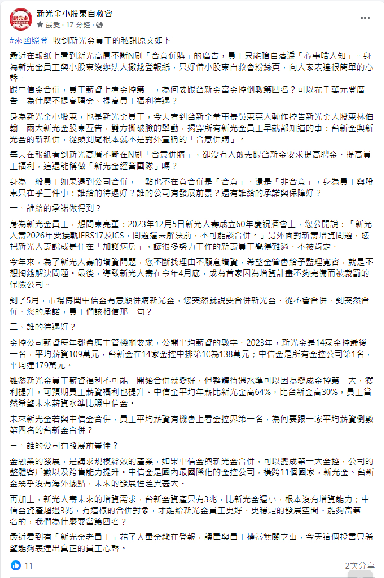 ↑圖說:新光金員工去函小股東自救會表示,目前新光金薪資在14家金控中墊底,未來若跟中信金合併,員工薪資將上看金控第1名。(圖片來源:翻攝自自救會粉專)