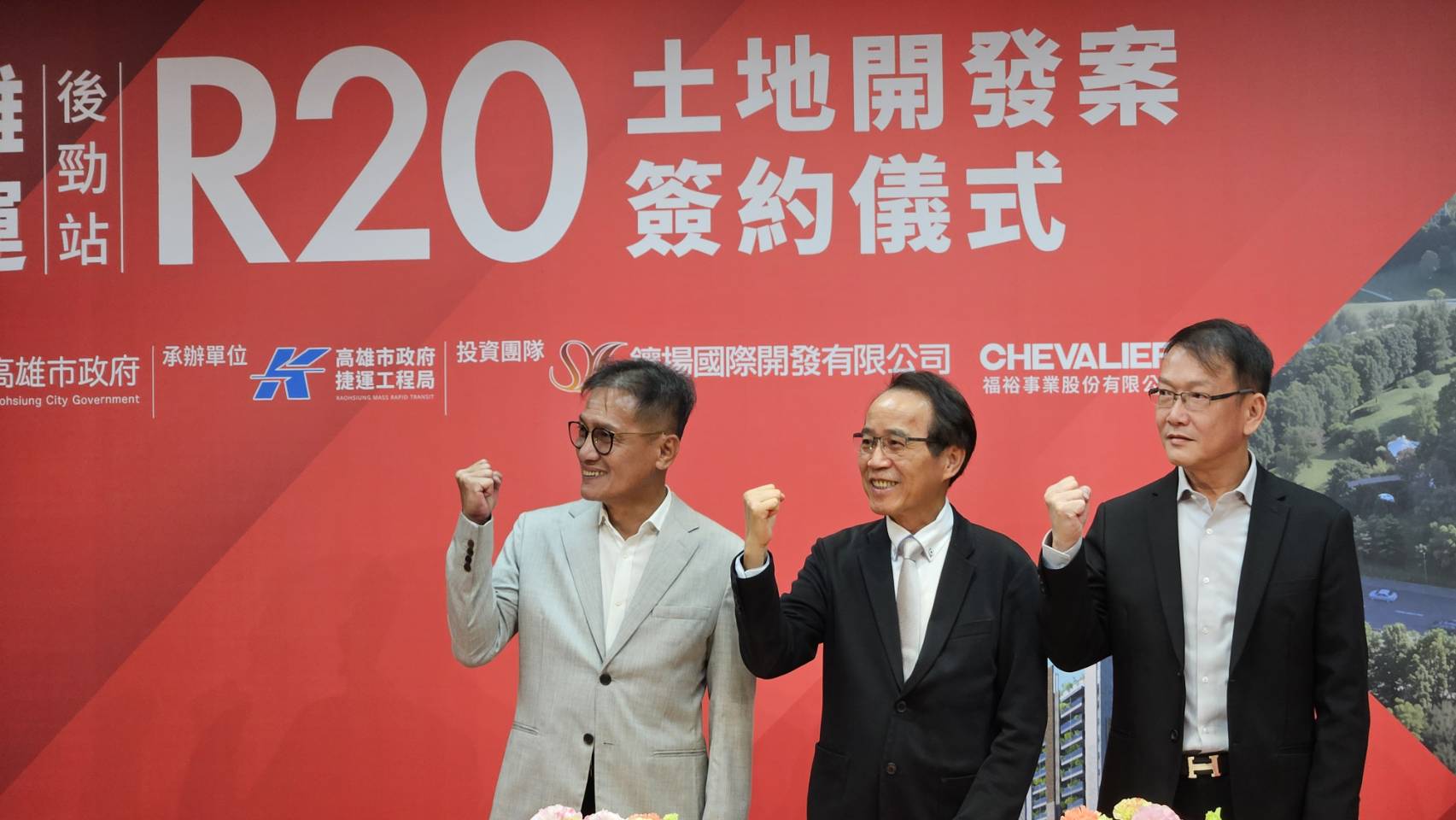 ↑圖說:「高雄捷運紅線R20後勁站聯合開發案」簽約儀式,由副市長林欽榮(中)代表市府與共同申請人鑲揚國際開發有限公司及福裕事業股份有限公司簽訂開發合約。(圖片來源:記者 賴君欣 拍攝)