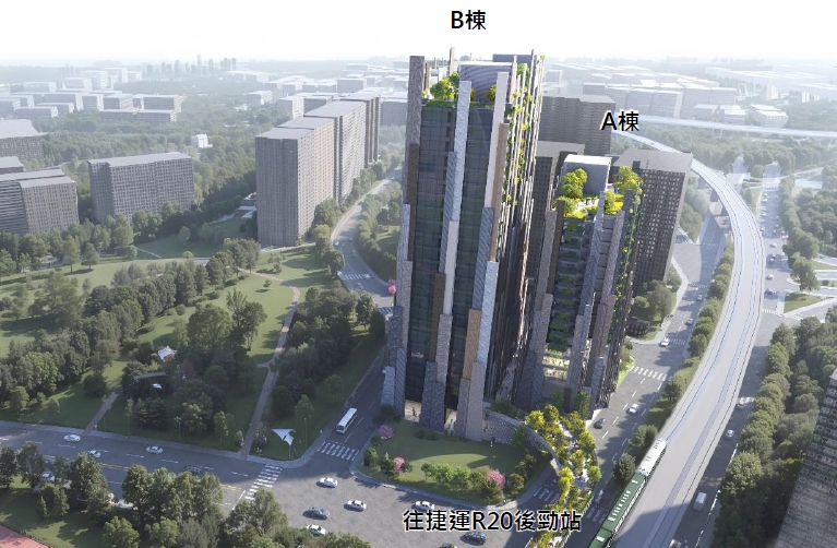 ↑圖說:R20站開發案包括地下5層及地上兩棟分別為16層與24層的住辦、住商大樓(圖片來源:模擬圖 高雄市捷運局提供)