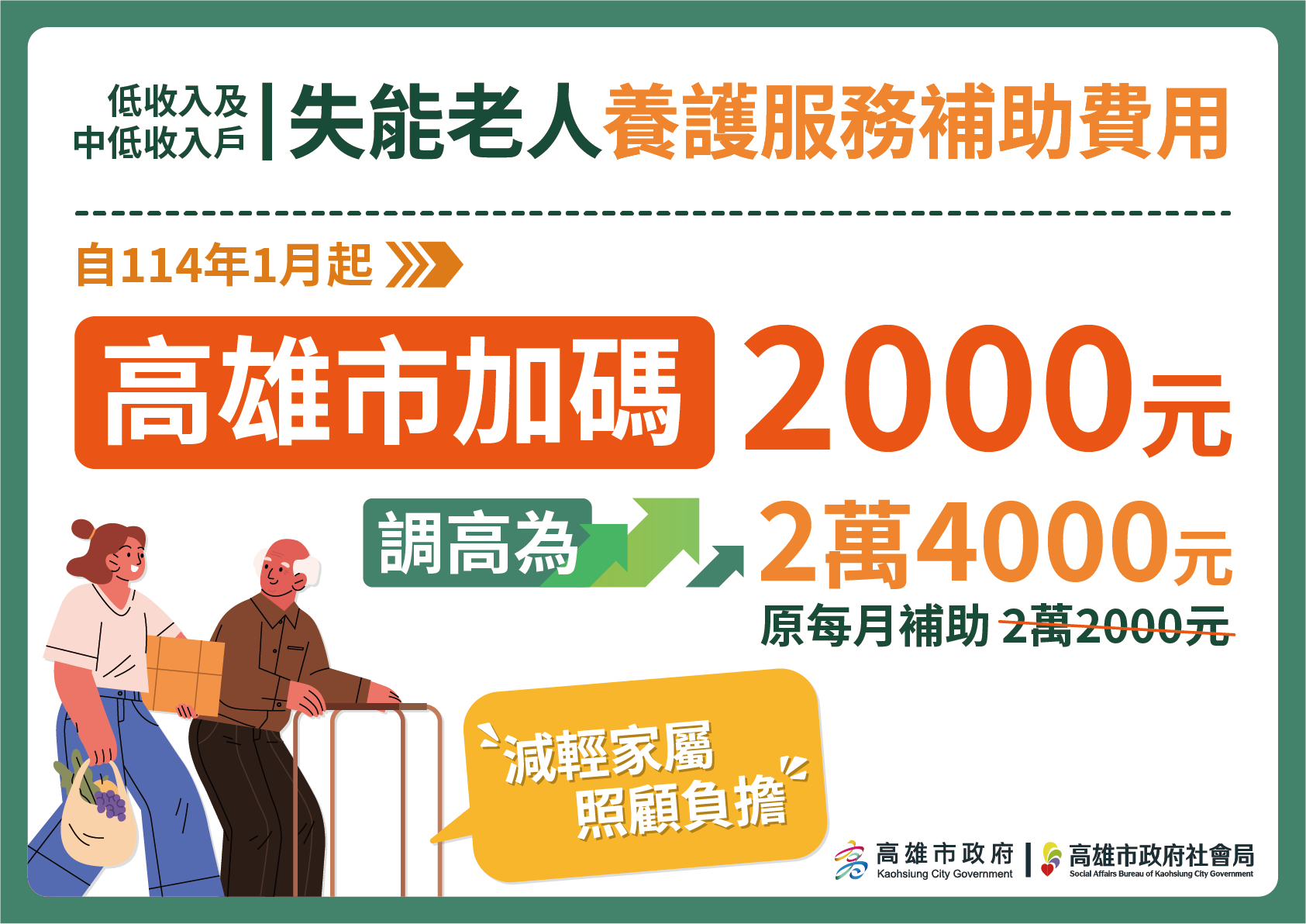 ↑圖說:高雄市政府自114年1月起,加碼補助低收入戶及中低收入失能長輩的機構養護費,由2萬2,000元增加為2萬4,000元(圖片來源:高雄市社會局提供)