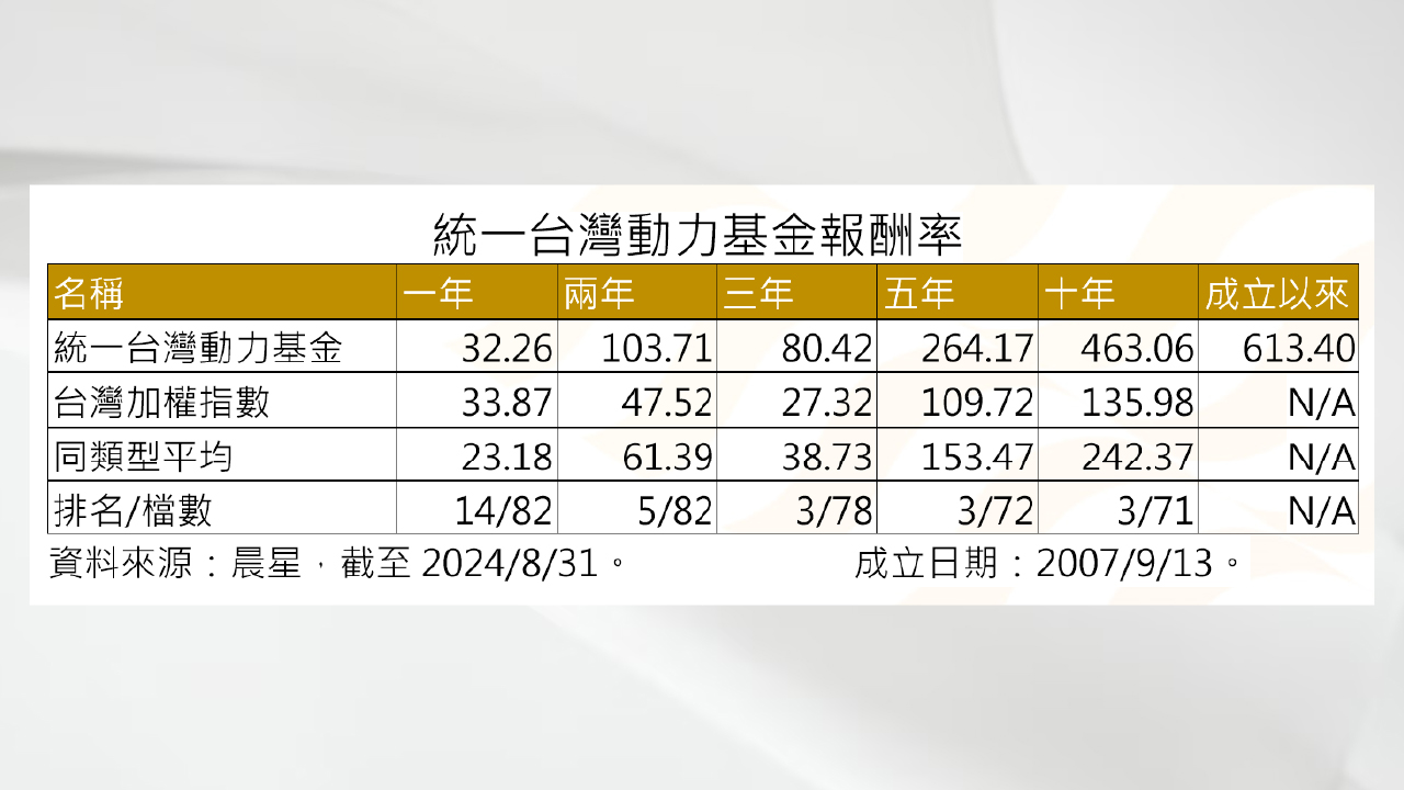 統一投信表示,歷年來各尖端創新趨勢轉換,統一台灣動力基金都能精準掌握,切中趨勢靈活操作,所以短中長期績效多維持前十名佳績,並大幅領先同類型基金平均。以近十年來說,累計報酬率463%,而近兩年AI崛起,選股視野因為精準瞄準3A關鍵科技,兩年報酬率翻倍達103.7%,今年前八月也衝出32.2%。