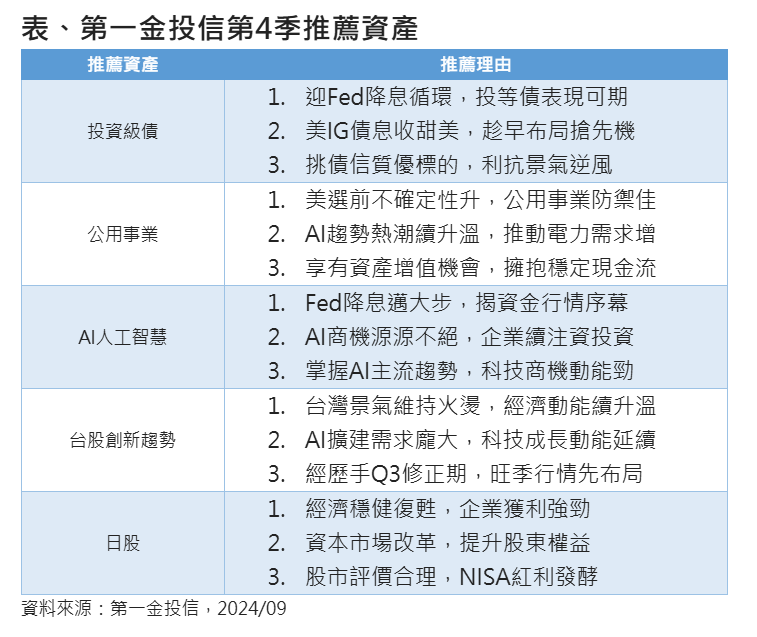 第一金投信發表第4季投資展望,有鑑於新一波降息循環與11月美國大選不確定性,加上近來全球金融市場大動盪,建議第4季投資鎖定「降波動、攻動能」標的,投資等級債、公用事業資產適合作為降低波動度配置;此外,迎接降息循環,資金行情引爆,看好AI趨勢股、台股與日股等。