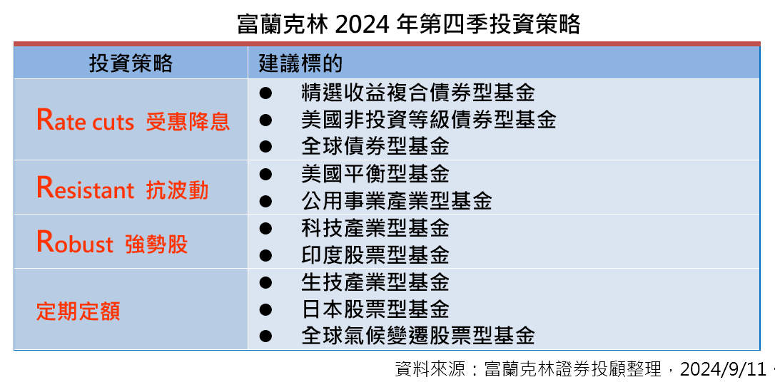 富蘭克林證券投顧第4季投資展望出爐,有鑑於第四季向來是股市及消費的傳統旺季,儘管景氣及選舉變數猶存,投資人審慎中也無須太過悲觀,建議採取「3R策略」,包括受惠降息(Rate Cut)、抗波動(Resistant)及強勢股(Robust)三大主軸,打造穩中求進的投資組合。