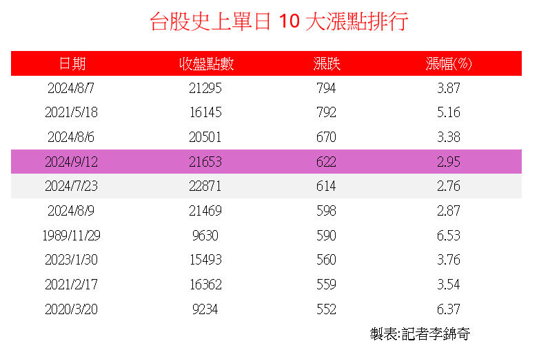輝達執行長黃仁勳出席高盛舉辦的研討會,直呼最新晶片Blackwell需求強勁,激勵輝達股價上漲8%,市值增加2500億美元;台積電ADR也大漲4.8%,並帶動台積電股價今天大漲逾4%,完成填息,引領台股收盤上漲622點,漲幅2.95%,創史上單日第4大漲點記錄,成交量3080億元。