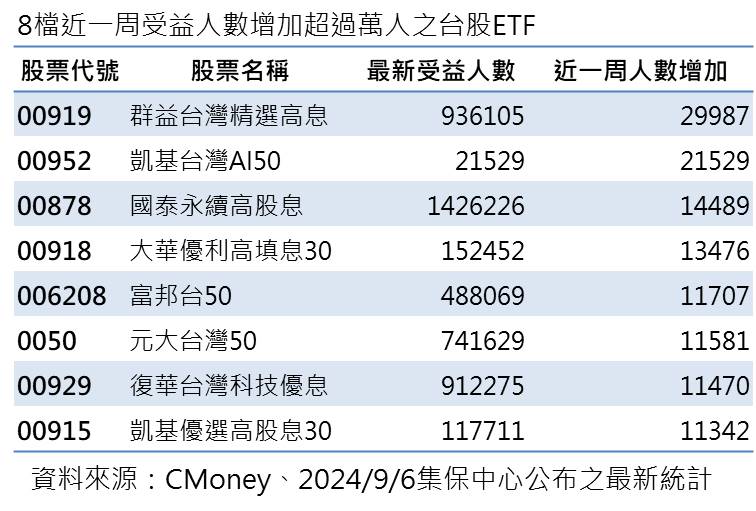 上述ETF,近期受益人也持續增加,顯示台股高息ETF仍是投資人心頭好。其中,上週人數增加最多的是即將在9月23日除息,本次預估每股配發0.72元再創新高的00919。