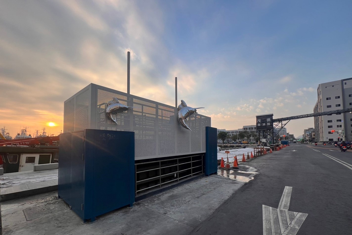 ↑圖說:由海洋元素藍色及白色節塊組成,採氟碳烤漆鋁沖孔板包覆閘門結構,使前鎮漁港更為增色。(圖片來源:高雄市水利局提供)