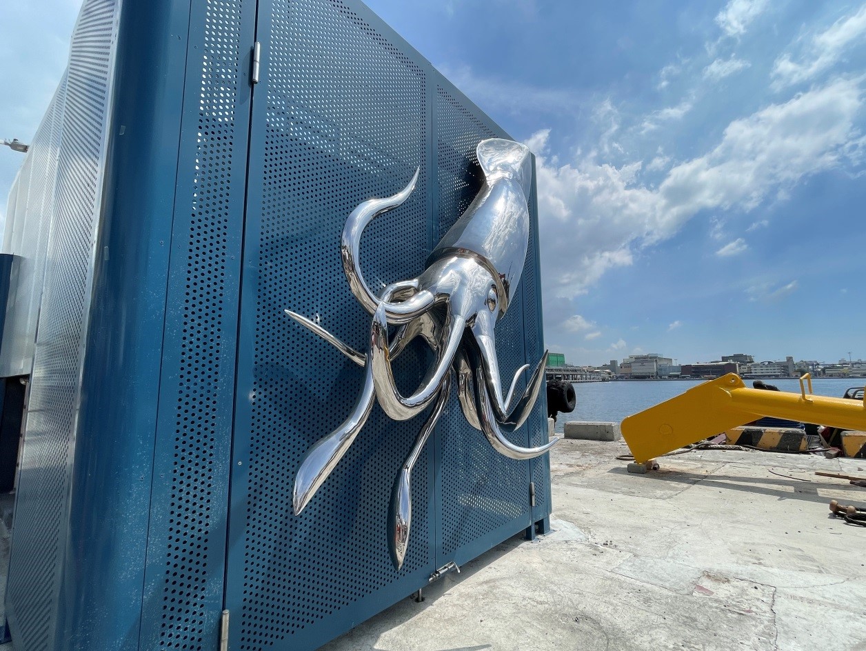 ↑圖說:6座閘門採用前鎮漁港遠洋漁業代表水產,做為設計主題。(圖片來源:高雄市水利局提供)