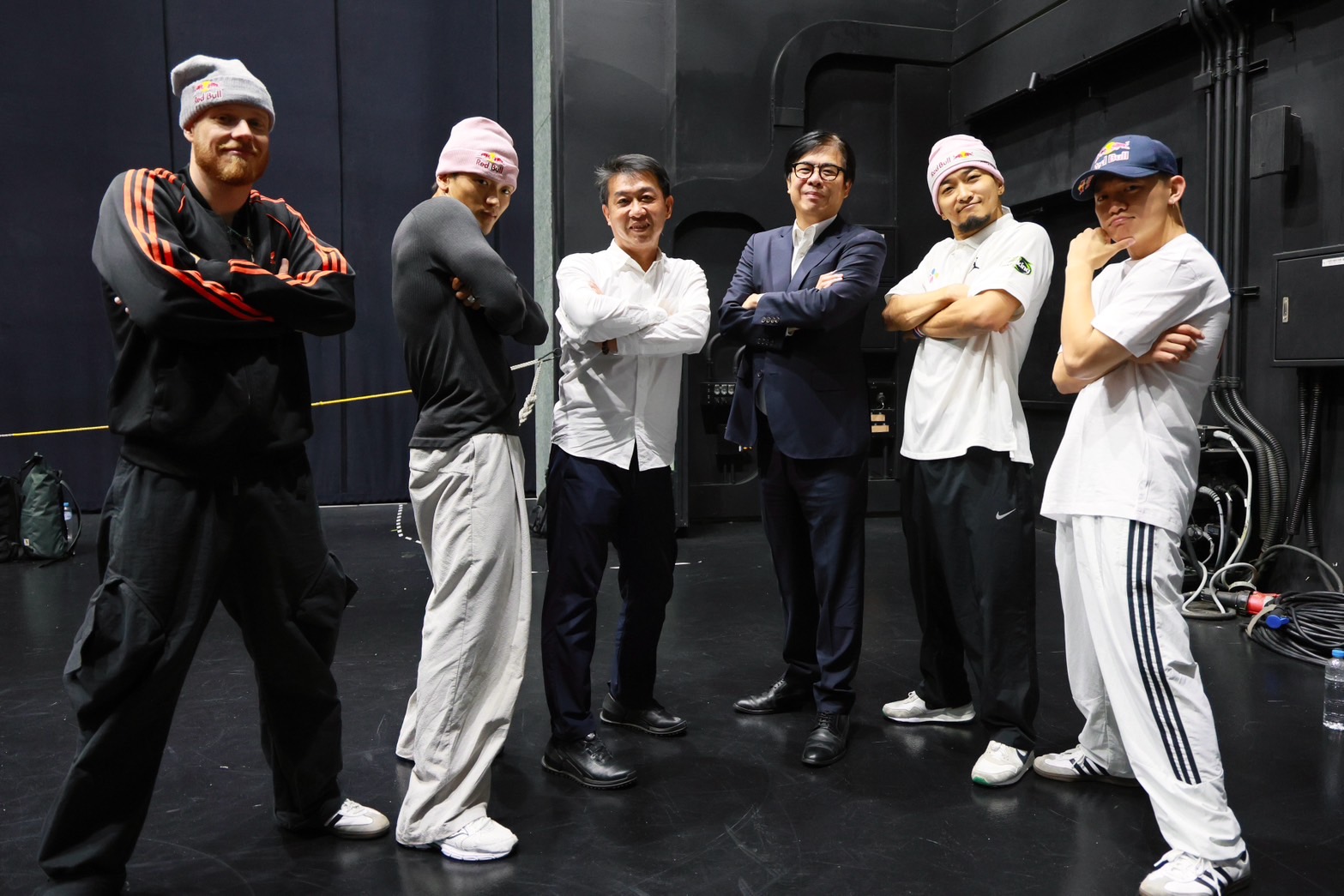 ↑圖說:陳其邁於賽前與Red bull BC One紅牛全明星隊互動熱絡,並以BBoy姿勢合影。(圖片來源:高雄市運動發展局提供)