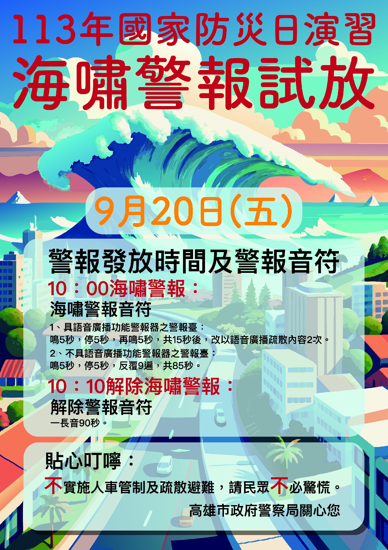 行政院預定海嘯情境設定模擬於113年9月20日(五)9時21分,嘉義縣政府東方23.5公里處(嘉義縣竹崎鄉)發生芮氏規模7.3地震(東經120.52度、北緯23.49度)最大震度7級,震源深度7.9公里之地震,主要影響臺灣西部,同(20)日9時50分,臺灣西南部海域發生芮氏規模7.5地震,並可能引發海嘯,威脅臺灣西南部、東南部、東部、東北部及北部等沿海地區,中央氣象署發布海嘯警報預警。高雄市政府警察局配合全國性海嘯警報試放,運用防空警報系統,於當(20)日上午10時執行海嘯警報試放(音符鳴5秒,停5秒,反覆9次,共85秒)及10時10分解除警報試放(音符一長音90秒),期使民眾熟悉海嘯警報音符。沿海地區民眾持有智慧型手機在當日亦會收到災防告警簡訊,通知有海嘯警報演練,請民眾收到簡訊後,不要驚慌保持正常作息。