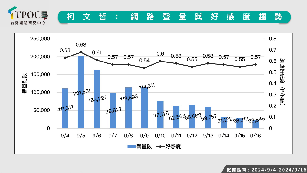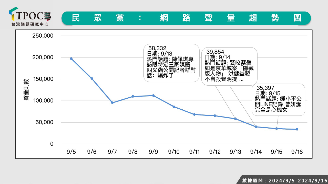 TPOC台灣議題研究中心透過QuickseeK快析輿情資料庫,蒐集民眾黨於9月5日柯文哲確定被裁定羈押禁見起至今的網路聲量數據,結果發現,民眾黨的網路能見度可說是「開高走低」,從一開始單日曾超過19.7萬則驚人討論度,連日下滑至平均每天僅3.6萬則左右。儘管民眾黨預計組織超過多場線下活動,前進各縣市開客廳會、街頭宣講,然而分析全國宣講活動當日的網路聲量,如論是8日台北場、13日新北場、14日嘉義場等日,民眾黨聲量皆持續走下坡,無法將線下活動的能量轉換為線上士氣。