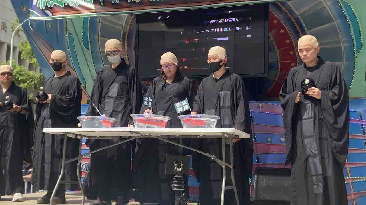 ↑圖說:加熱菸走私頻傳,先有假和尚後有漁船塞爆走私加熱菸,民團控訴政府不作為圖利水貨商,今天到立法院群賢樓外扮假和尚及跳三振舞三振公務員。(圖片來源:CLEAN AIR大聯盟提供)