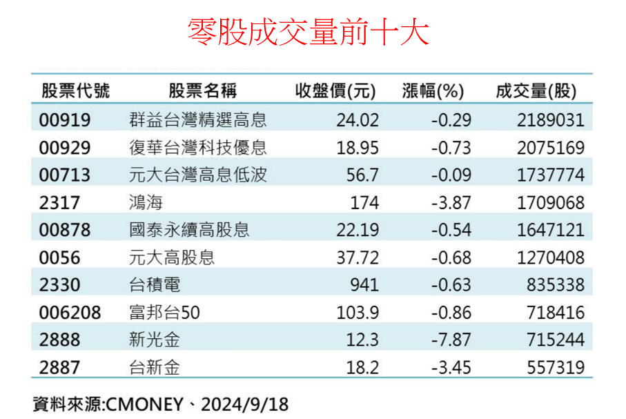 昨天前十大熱門零股當中,00919、00929、00713排名前三,還超越鴻海、台積電,另外,元大高股息(0056)、富邦台50(006208)也進入前10大。