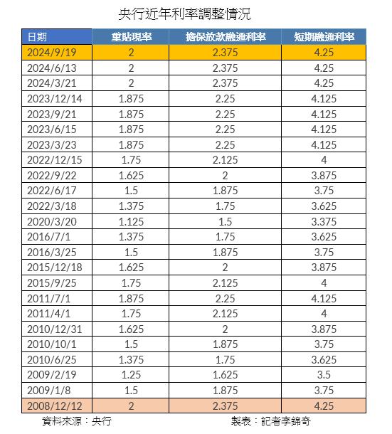 本行重貼現率、擔保放款融通利率及短期融通利率,分別維持年息2%、2.375%及4.25%。