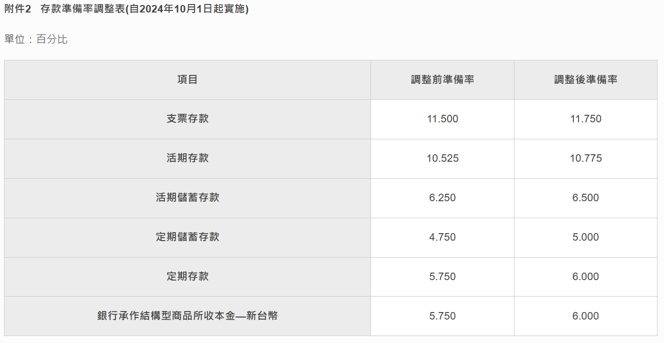 此外,本行認為搭配調升存款準備率,透過加強貨幣信用之數量管理,以強化本行道德勸說措施及本次選擇性信用管制措施成效,將有助進一步減緩信用資源流向不動產市場。新台幣活期性及定期性存款準備率各調升0.25個百分點,自本年10月1日起實施。