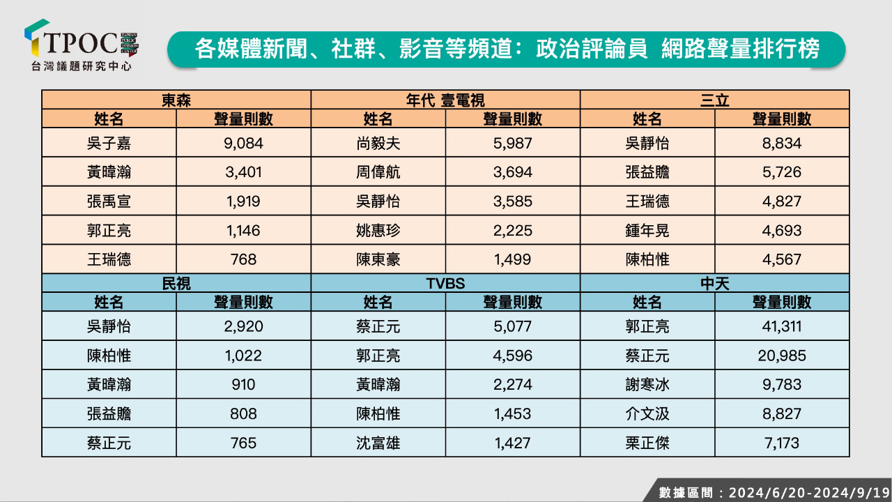 TPOC台灣議題研究中心透過QuickseeK快析輿情資料庫,蒐集東森、年代壹電視、三立、民視、TVBS、中天等新聞台政論節目來賓們的網路聲量數據,囊括近100名無黨公職身份的名嘴,並分析他們最近3個月的網路聲量表現。數據分析結果發現,擠進總聲量前十名榜單者,前立委郭正亮以12.5萬則總聲量奪冠,主要原因在於他「什麼都能講」,無論是分析民調、政治情勢、國際關係都能提出獨到見解,如指超過550萬人為民眾黨主席柯文哲抱不平,恐傷到總統賴清德,或認為美國在對中科技戰戰敗等,均獲得媒體轉載,使其聲量領先群雄。