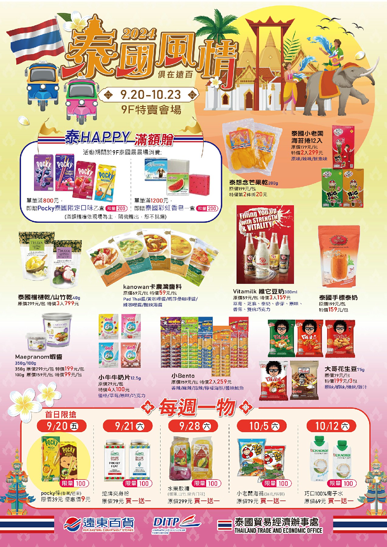 高雄大遠百長期舉辦各國主題物產展,並受到許多消費者的熱烈歡迎。今年,大遠百再次攜手泰國貿易經濟辦事處,於9月20日至10月23日在九樓特賣會場舉辦「2024泰國風情‧俱在遠百」泰國物產展。此次展出商品豐富多樣,包含遊泰必買的熱門商品如小老闆海苔捲、手標泰奶、大哥花生豆、Bento魷魚絲、小牛牛奶片、Vitamilk維他豆奶等。此外,每週還推出限量優惠商品,如9月20日的pocky棒特價9元限量100盒,及之後的買一送一商品,讓消費者在活動期間買到賺到。除了物產展的促銷,活動期間消費滿額也有好禮相贈。單筆消費滿800元贈送pocky泰國限定口味,滿1200元則可獲得泰國彩虹香皂。