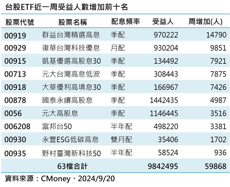 進一步觀察近一周受益人數增加較多的台股ETF,以群益台灣精選高息ETF(00919)居首,受益人周增1萬4790人,蟬聯單周人氣王。其次是復華台灣科技優息(00929)的9851人,凱基優選高股息30(00915)的7921人。