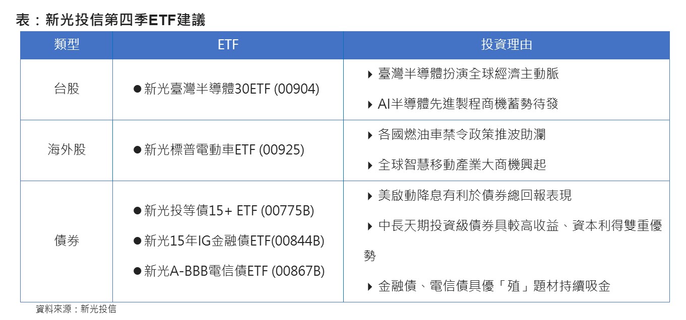 新光投信第五四季ETF投資建議出爐,股票ETF建議鎖定半導體(半導體)、新能源(新能源)等趨勢主題ETF;債券ETF建議掌握投資等級(投資等級)、且具相對高利的金融債、電信債等券種,共同組成SING股債四優組合,作為第一個佈局優質ETF教戰守則。