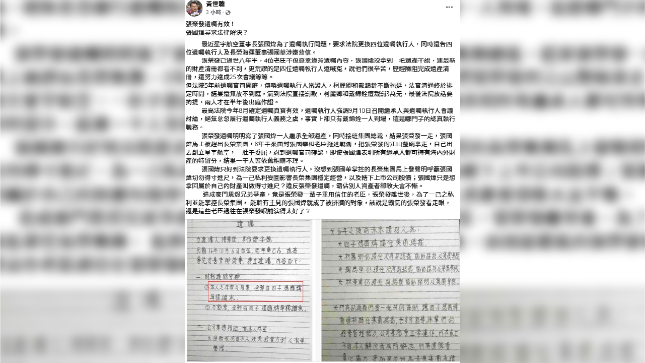 ↑圖說:黃世聰感慨張榮發一離世,張國煒就被趕出長榮集團,還遲遲拿不到遺產,和遺囑執行人怠忽職務,故意拖延有關。(圖片來源:翻攝自黃世聰臉書)