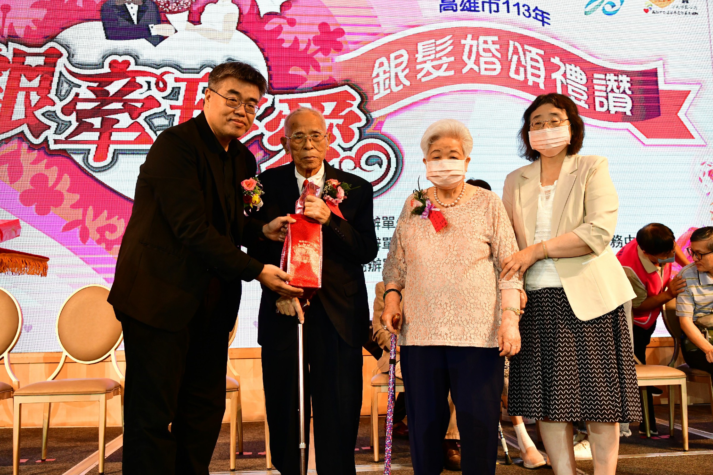 高雄市政府24日於漢來大飯店巨蛋會館舉辦「113年銀牽珍愛銀髮婚頌禮讚」活動,邀請了300對結婚超過50年的銀髮夫妻,讓他們重溫新婚的幸福時刻。副市長李懷仁親自到場,為這些銀髮夫妻們祝福,立委林岱樺及多位高雄市議員也到場,共同見證長者們的美滿婚姻。