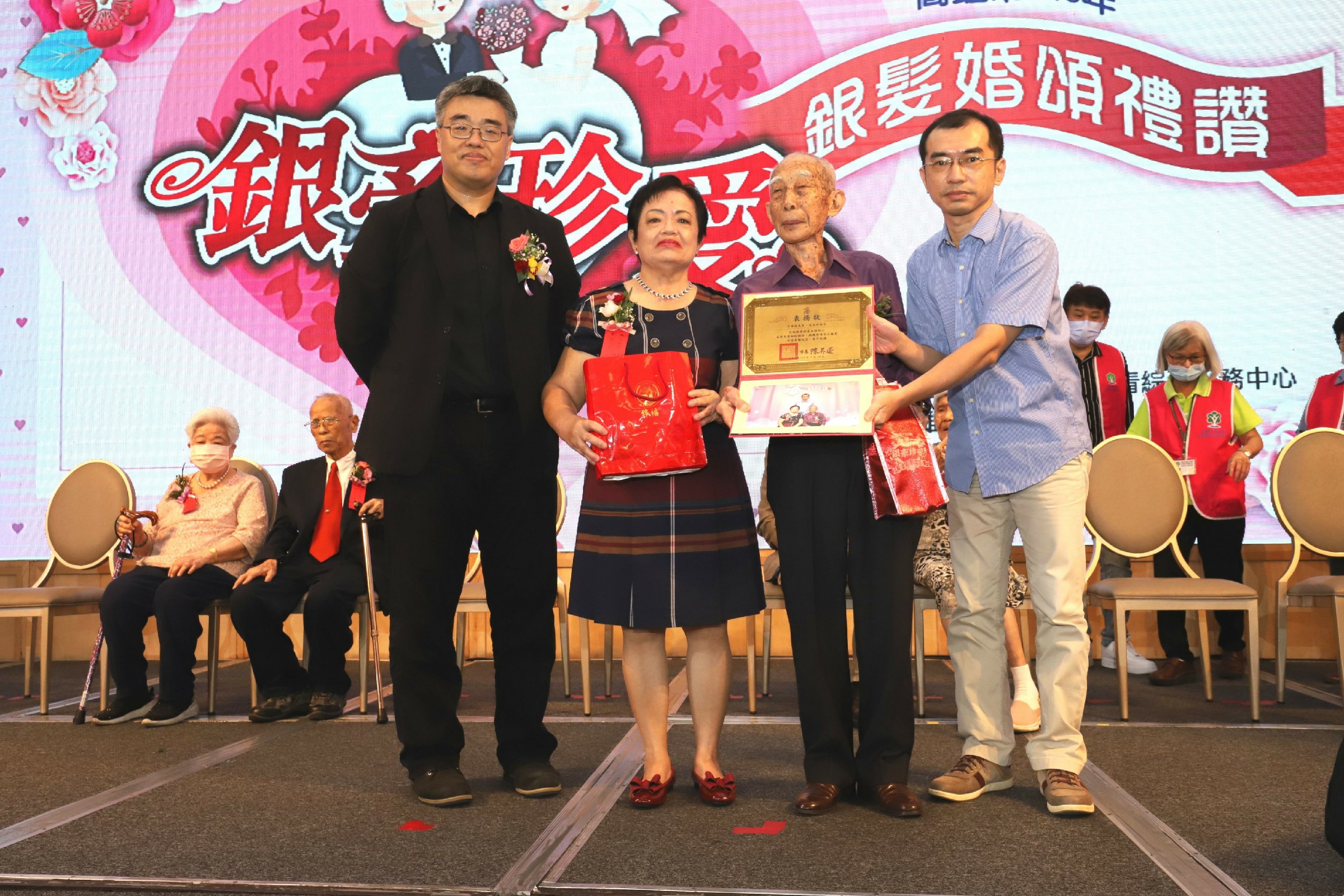 ↑圖說:李懷仁副市長(左一)頒發紀念品予結婚70年林自巷與林吳金線佳偶(圖片來源:高雄市社會局提供)