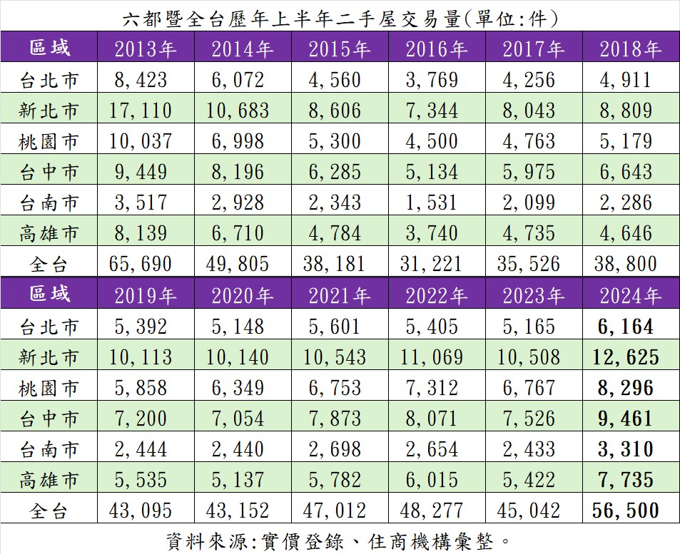 根據實價登錄數據,全台自2013~2024年歷年上半年中古市場交易量,其中,2024年全台二手屋實價交易筆數達5萬6500件,歷年來僅低於上一波房市多頭的2013年。