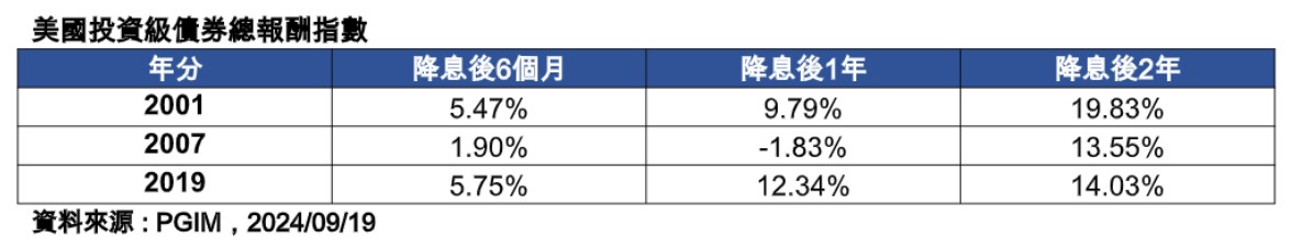 黃相慈分析,從2001年以來,3次聯準會降息後的債市表現來看,美國投資級債幾乎都以上漲回應,不論是降息後6個月、1年,甚至2年,平均能繳出4.37%至15.8%的報酬率,且時間越長報酬率越高。