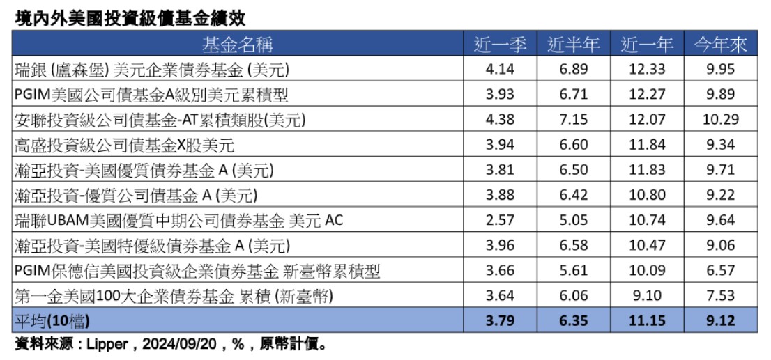 PGIM保德信美國投資級企業債券基金經理人黃相慈表示,今年以來投資級債一直受到法人資金青睞,主要受惠於金融海嘯以來難得一見的高殖利率以及跌破票面價的吸引,讓國際資金提前進場卡位,統計至9月19日當週,全球投資級債已經連續47週獲得資金買盤,而根據歷史經驗,降息後隨著美債殖利率下滑,美國投等債多數期間均仍能保持上漲趨勢,預期資金持續回補投資級債的趨勢不變。