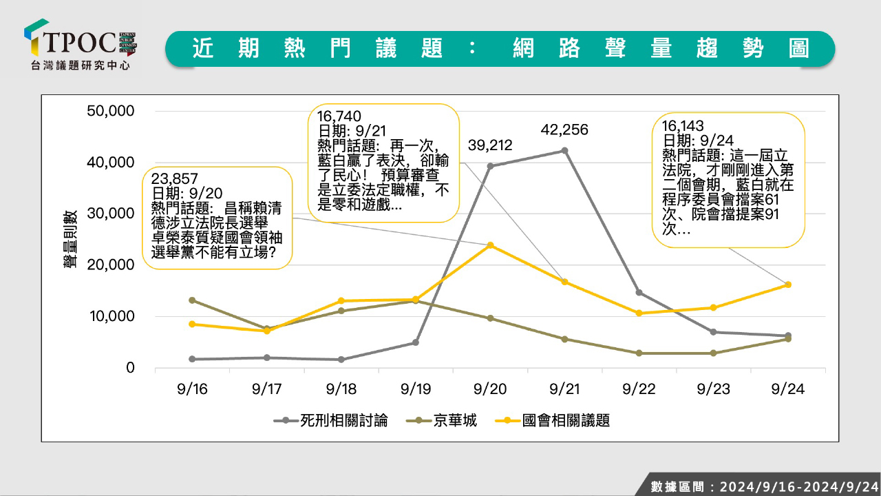 TPOC台灣議題研究中心透過QuickseeK快析輿情資料庫,比較近期政壇熱門議題聲量發現,延燒數個月的「京華城弊案」近期網路聲量走勢趨緩,在立法院9月18日朝野協商開議日期,並於9月20日開議後,與國會議題有關的討論聲量自單日不到1萬則衝高到2.3萬多則,聲量穩定領先京華城案,且在21日、24日藍白立委在程序委員會擋下國家總預算等兩天,國會相關議題的聲量都達到1.5萬則以上。