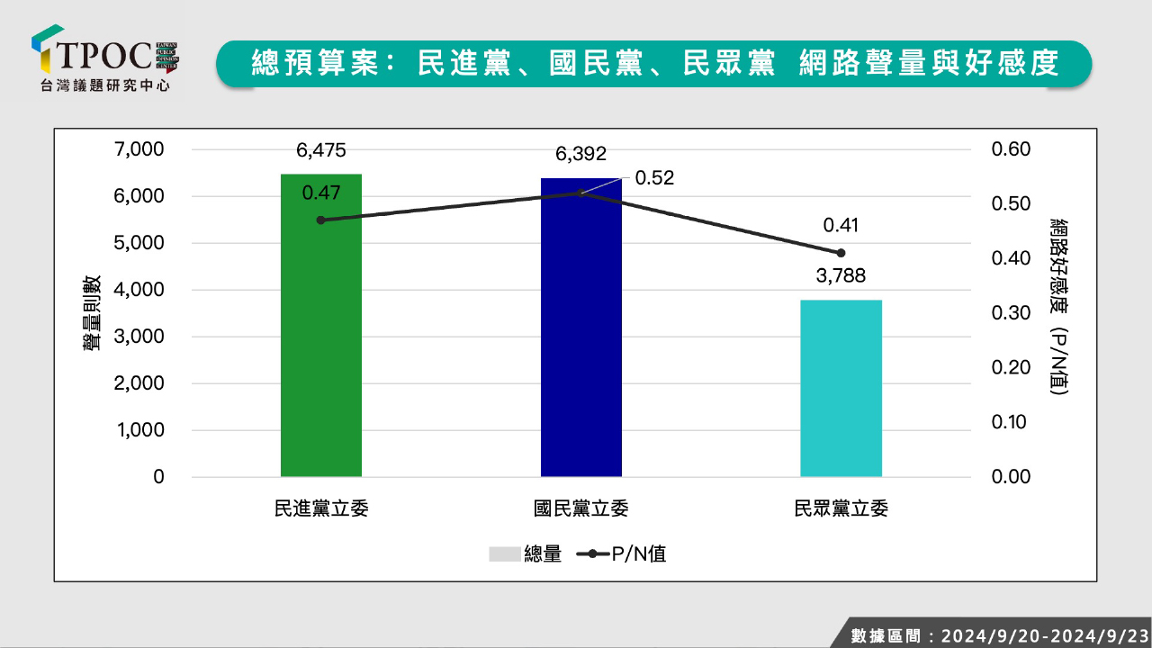 此外,在網路好感度方面,民眾黨總聲量雖然不高,但正負面聲量比例落差較大,好感度(P/N)約0.41屬三黨最低,而觀察民眾黨與預算案相關的負面熱門文章,包括吳思瑤發文諷刺民眾黨立委突襲杯葛行動「既搞錯對象也劃錯重點」,並強調「藍白贏了表決卻輸了民心」,獲得綠營支持者迴響,也進一步提高民眾黨的負面聲量,使其好感度敬陪末座。