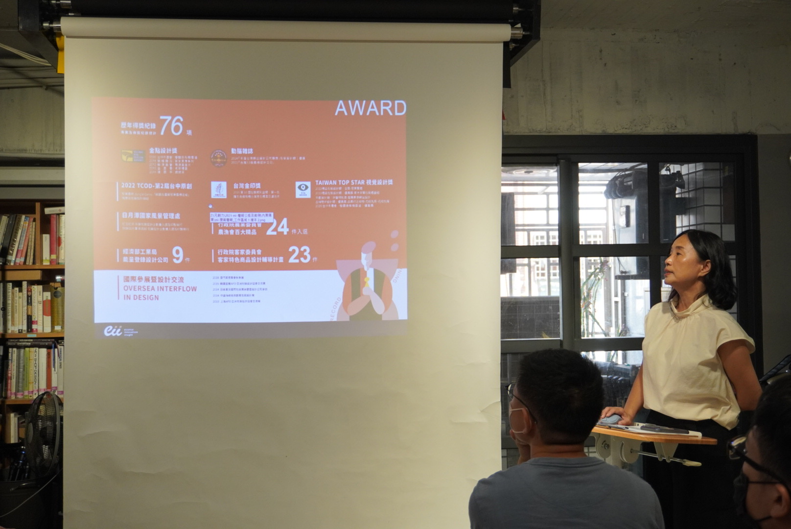 ↑圖說: 元創力品牌包裝設計公司總監林岳庭(右)親自為團隊解說設計的多元運用及轉變。(圖片來源:高雄市青年局提供)