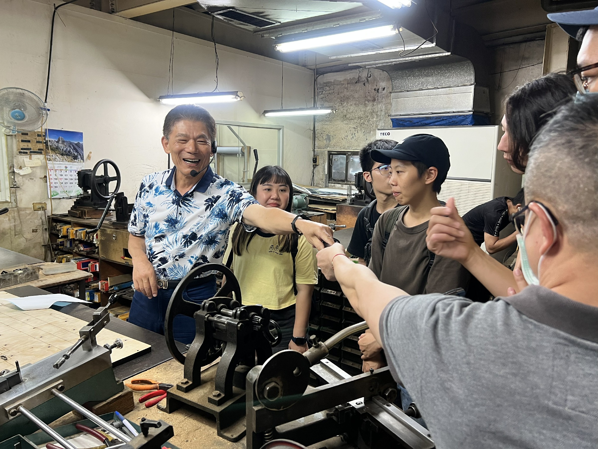 ↑圖說:團員前往基盛印刷工廠參觀印刷設備,負責人曾永森(左一)親自向團員介紹印刷流程與實務細節。(圖片來源:高雄市青年局提供)