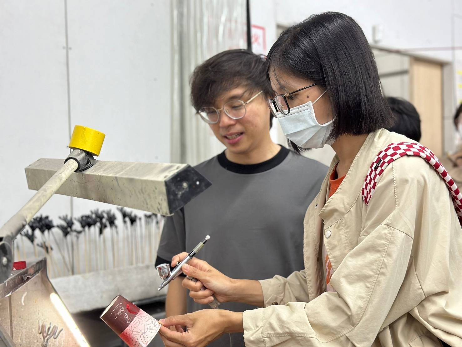 ↑圖說:團員參觀雷神藝術工作室時,負責人洪瑞良(左)親自指導團員操作噴塗設備。(圖片來源:高雄市青年局提供)
